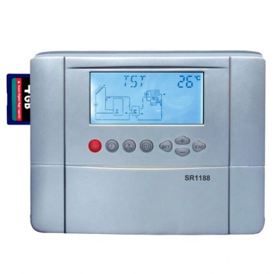 Контроллер SR 1188 открывает широкие возможности по использованию солнечных систем теплоснабжения. Контроллер SR 1188 предназначен для малых и средних гелиосистем. 26 установочных категорий позволяют наращивать систему без замены контроллера. Возможность подключения до 8 температурных датчиков позволяет регистрировать температуру одного или двух коллекторных полей и одного или двух баков-накопителей, а также регулировать работу не только насоса коллекторного контура, но и контуров ГВС, отопления и функции подогрева горячей воды.